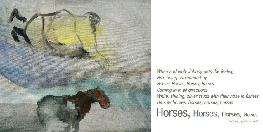 “..the feel of horses long before horses enter the scene..” schreibt Patti Smith am Covertext ihres stilprägendes Debütalbums “Horses” von 1975. Was hier als Ahnung einer sich aufbauenden Spannung formuliert ist gilt gerade so für die Malerei. Die figurative Malerei ist hier besonders gefordert, weil sie immer auch noch der Darstellung verpflichtet ist.